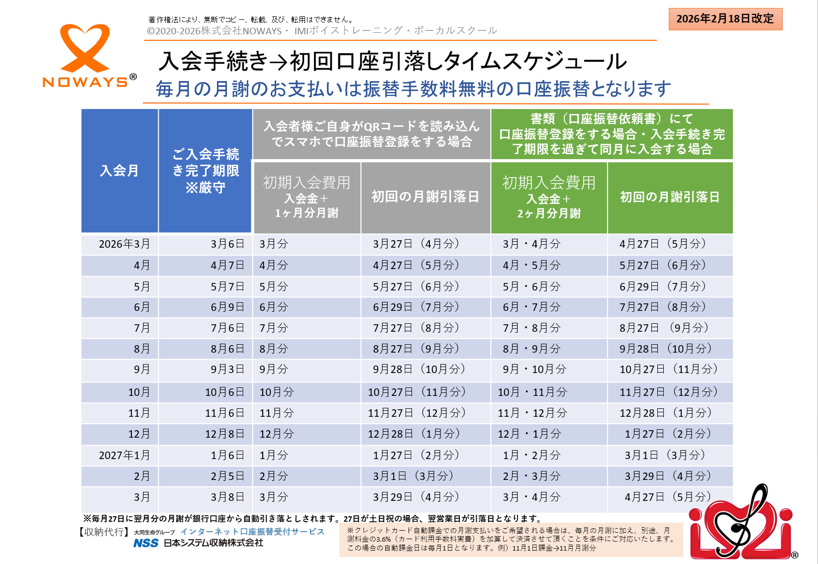 こちらの手続きには毎月締め日があります。ご希望する入会月の「ご入会手続き完了期限」までに必ずお手続きをお済ませください(下の表を参照ください)。その期日を過ぎますと翌月からのご入会、もしくは、入会初期費用が入会費+月謝2か月分となってしまいます。あらかじめご了承くださいませ。