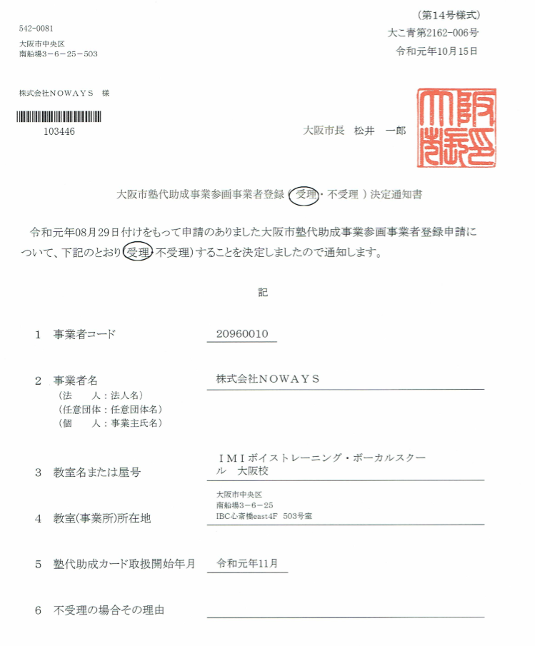 IMIボイストレーニング・ボーカルスクール大阪校は、「大阪市塾代助成事業参画事業」に参画・登録している「地域密着型」のボイストレーニング・ボーカルスクールです。