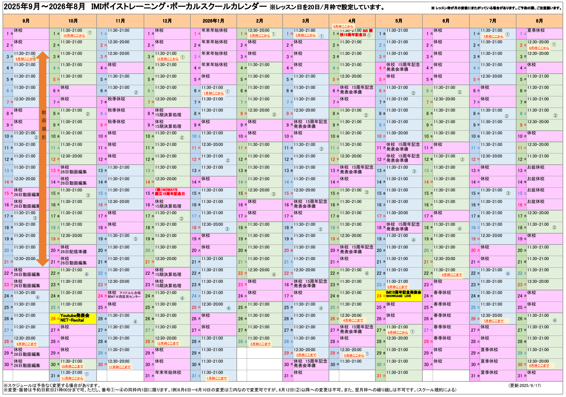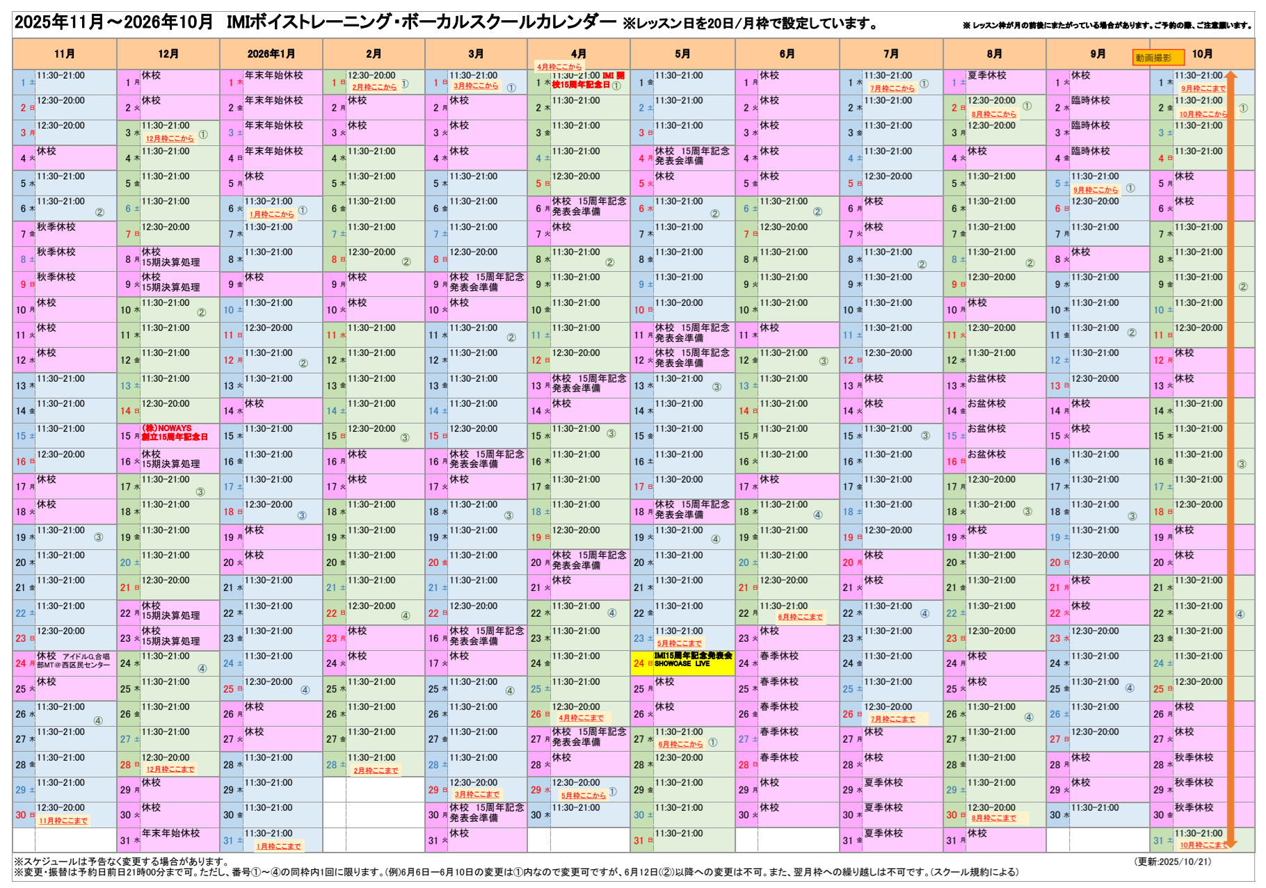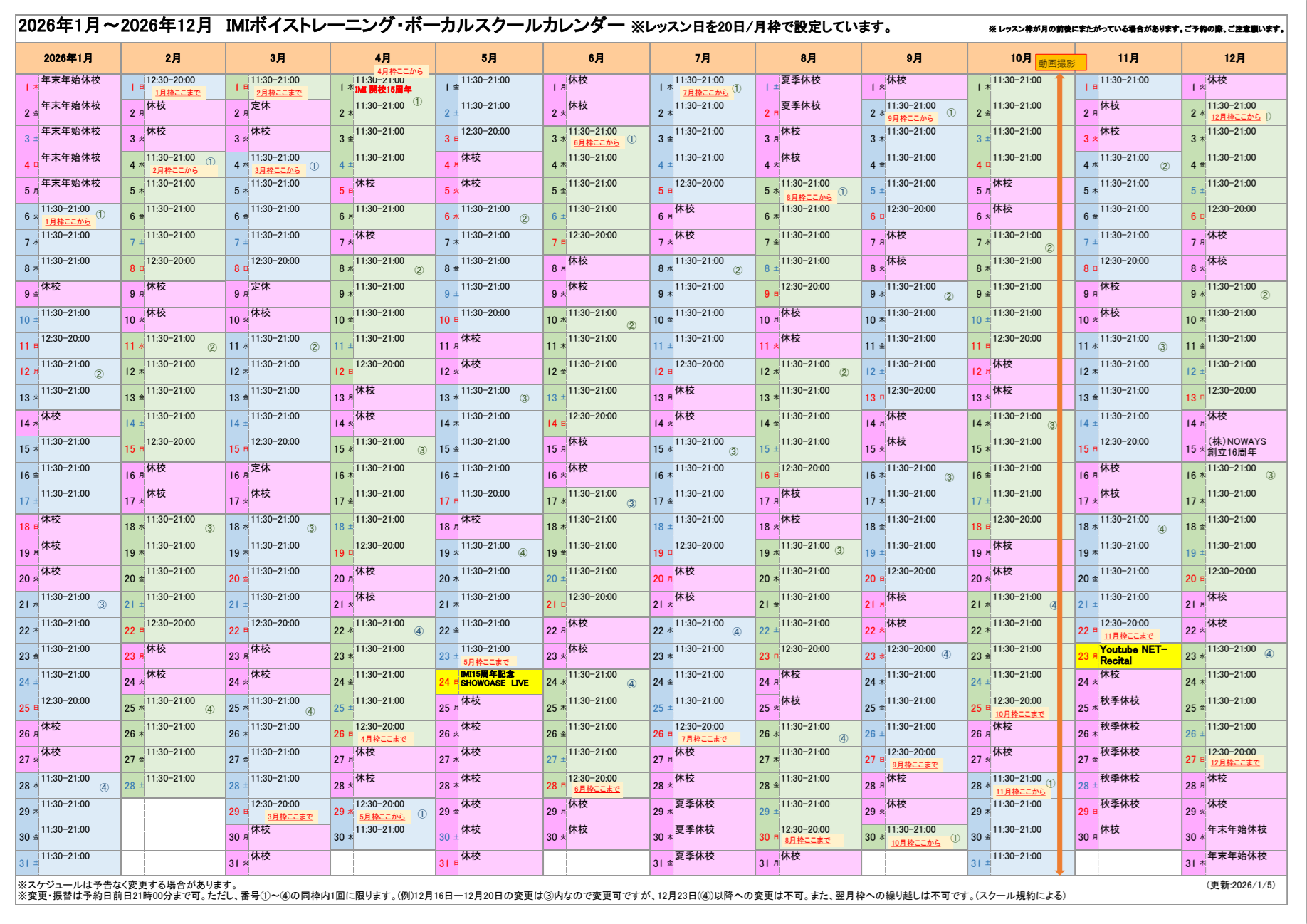 IMIボイストレーニング・ボーカルスクール大阪校スクールカレンダーです。